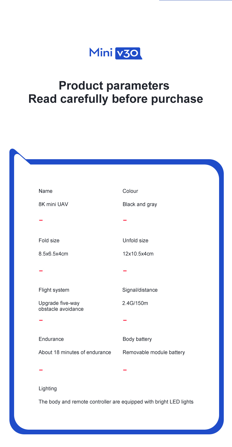 The 4DRC V30 Mini Drone features a foldable design, making it highly portable and easy to carry. Equipped with a WIFI camera, it supports real-time image transmission to mobile devices via an APP, enabling photo and video capture. Its modular battery system ensures convenient replacement, while enhancing safety and stability during flight. The drone is made of high-strength, crash-resistant engineering plastics, ensuring durability and reliable performance for beginners and educational use.