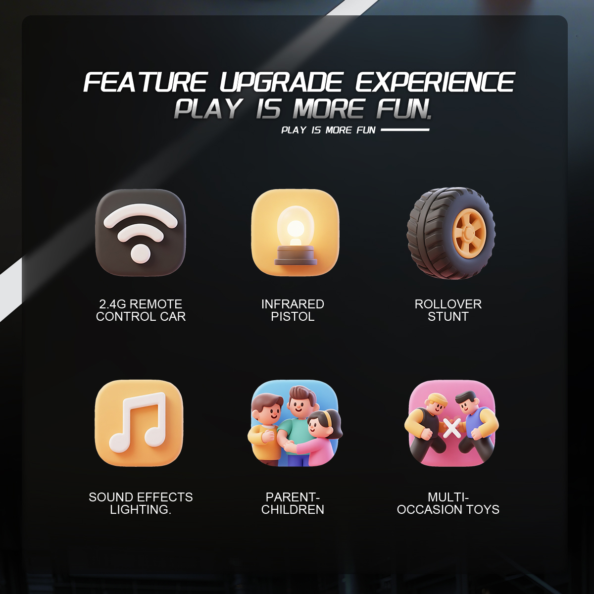 Experience the ultimate "Cat and Mouse" battle with this action-packed Infrared Combat Racing Set! This interactive toy pits a driver against a shooter: one player navigates the high-speed RC car to dodge attacks, while the opponent aims to strike it with the infrared blaster. The car features a real-time damage system with 4 lives—survive the chase or endure four hits and watch the car dramatically flip over in defeat. It’s high-speed, competitive fun perfect for siblings and friends.